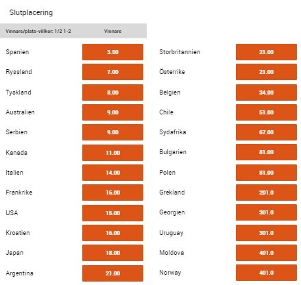 Det var de mest betrodda lagen men det finns givetvis odds på samtliga lag, och det är en jämn turnering det här där mycket kan hända. De allra flesta lagen har bra toppar då kvalificeringssystemet är uppbyggt kring landets bästa spelare. Därför finns Moldavien, Georgien och Bulgarien med trots att de endast har en spelare som håller någon som helst nivå. Med en bra etta har man alltid chansen att få till en avgörande dubbelmatch och det är lite enklare att skrälla i dubbel än i singel. Därav att oddsen på slutsegrare är ganska jämna.