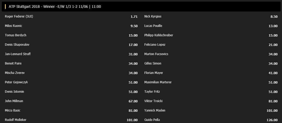 Nu går det tyvärr inte att spela på att Federer inte vinner turneringen hos Bethard*. Vill man spela på det får man söka sig till Betfair där man just nu kan få runt 2,15 på att han inte vinner, vilket det är monstervärde i.