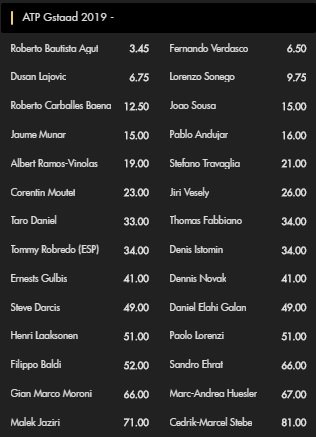 Jag håller med oddsen. Jag tycker att Bautista är storfavorit, större favorit än vad oddsen indikerar. Han brukar också vara bra på att hålla koncentrationen även i dessa mindre turneringar. Lajovic vann i Umag och är första utmanare men nej, jag spelar klart hellre Bautista. Jag tycker oddset är mer än okej.