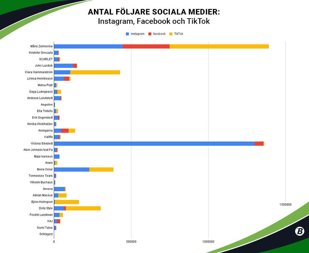 - Av alla artister är det endast Måns Zelmerlöw som har en stor närvaro på Facebook. I övrigt är det Instagram, tätt följt av TikTok, som är de stora sociala medierna.