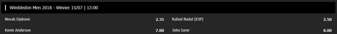 Grattis Frankrike och Kroatien till finalplatserna i VM. Jag ska så klart skriva vidare om fotboll, och andra sporter, här på Betting framöver. Fantastiskt roligt. Men jag ska givetvis också skriva om tennis, som är det jag tycker mig kunna bäst. Vi är framme vid semifinaler i Wimbledon och man kan lugnt säga att det hänt lite med oddsen från igår till idag.