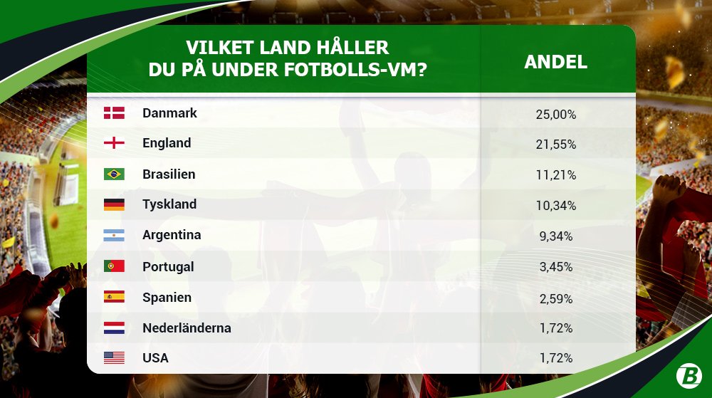 Inte helt överraskande är det vårt grannland Danmark som toppar listan, med 25 procent av rösterna. Det har ju varit lite av en kontrovers de senaste åren, särskilt i sociala medier, om det är rätt eller inte att heja på ett grannland.