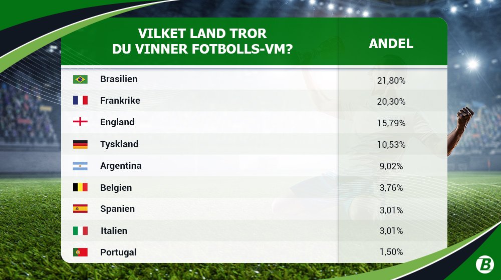 När det gäller vilket land som står som segrare av Fotbolls-VM i finalen den 18 december visar undersökningen att besökarna på betting.se tror allra mest på Brasilien och Frankrike. Detta är också två av landslagen som har lägst odds på förhand.