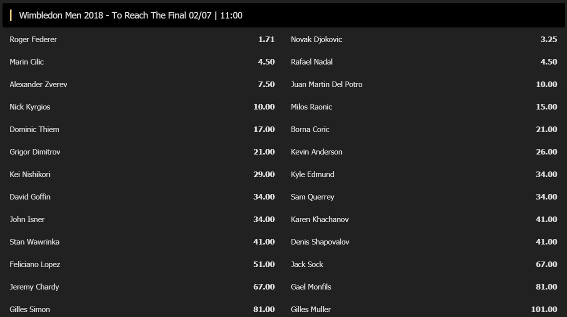 Federer har stigit lite senaste veckan, men inte tillräckligt mycket. Med tanke på hans förlust mot Coric i Halle och hans eventuella ryggproblem, jag skulle säga att det är snudd på dumt att spela på honom till 2,75 gånger pengarna. Man måste åtminstone studera hur han ser ut i första omgången idag innan man spelar. Och det går i vanligt finfint det. Precis som alltid uppdateras vinnaroddsen hos Bethard* varje dag under hela Wimbledon.